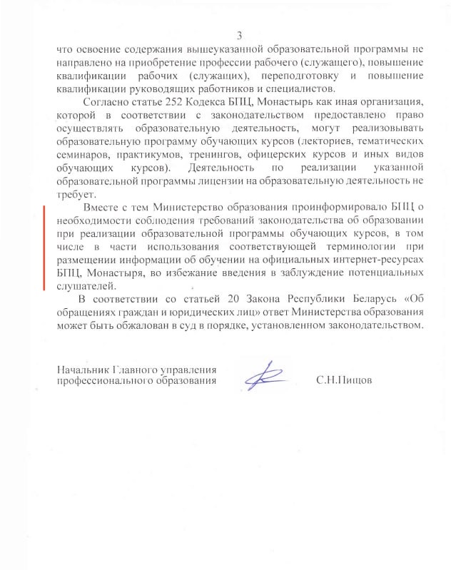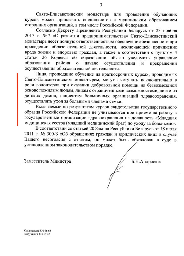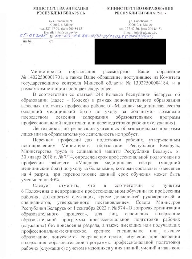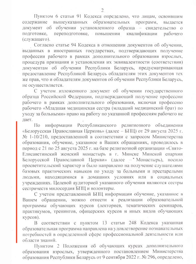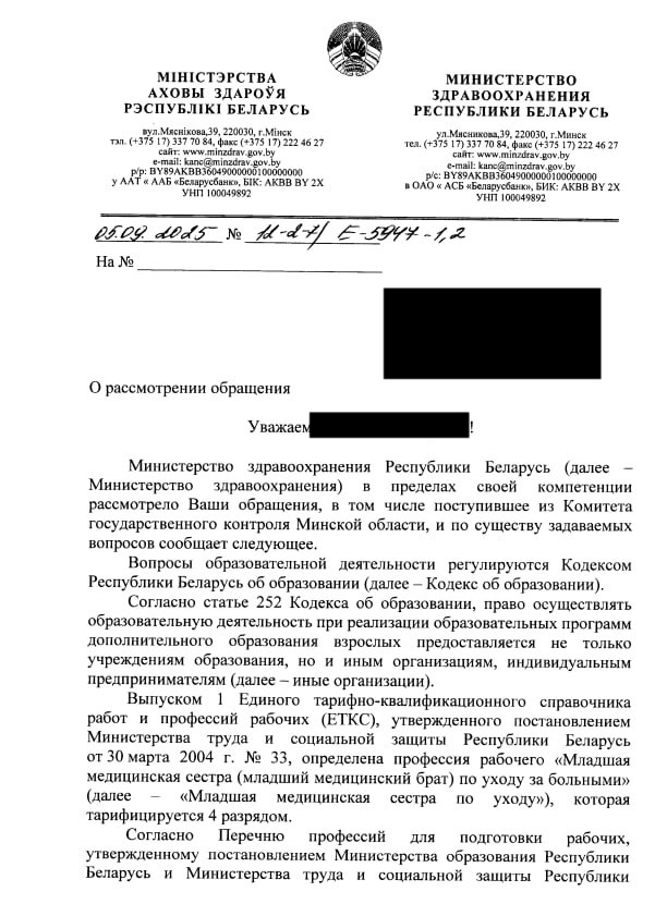 У «Христианской визии» имеется ответ от 5 сентября 2025 года от двух Министерств Республики Беларусь — здравоохранения и образования — на обращение граждан об описанных нами «курсах сестринского дела» при СЕМ и «присвоении квалификации “Младшая медицинская сестра / младший медицинский брат по уходу за больными”» после их окончания. Примечательна следующая информация в официальных документах Министерства здравоохранения и образования Беларуси.