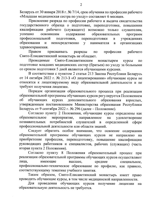 Министерство здравоохранения, в свою очередь, отметило что курсы, проводимые Свято-Елизаветинским монастырём, не дают права на присвоение разряда и работу по профессии «младшая медсестра (брат) по уходу за больными». Подобные занятия носят просветительский характер и могут использоваться лишь в роли волонтёрской или семейной помощи, но не признаются как профессиональная подготовка в системе здравоохранения.