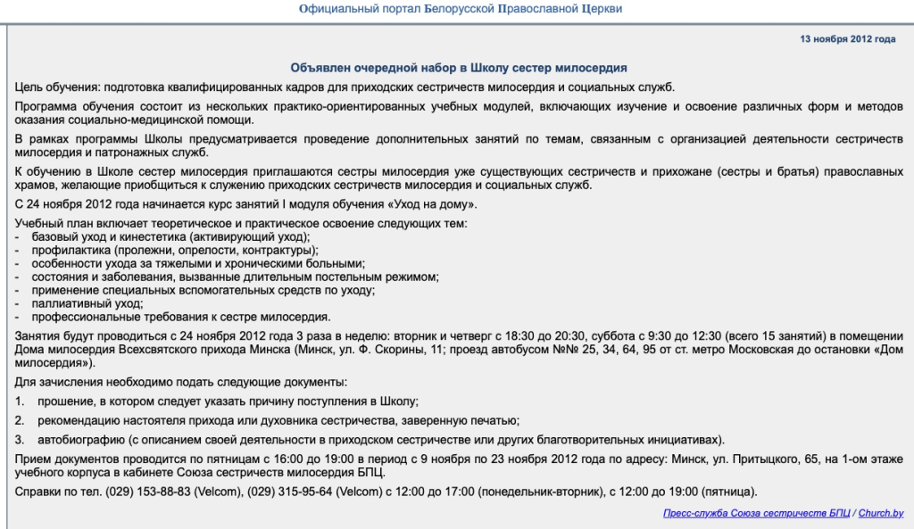 Поскольку сайт Союза сестричеств милосердия БПЦ недоступен, на основании цифровых следов в интернете можно увидеть, что в свое время ССМ БПЦ организовывал свои курсы сестер милосердия. На скриншоте объявление о наборе в Школу сестер милосердия 2012 года (подобные курсы организовывались на протяжении многих лет).