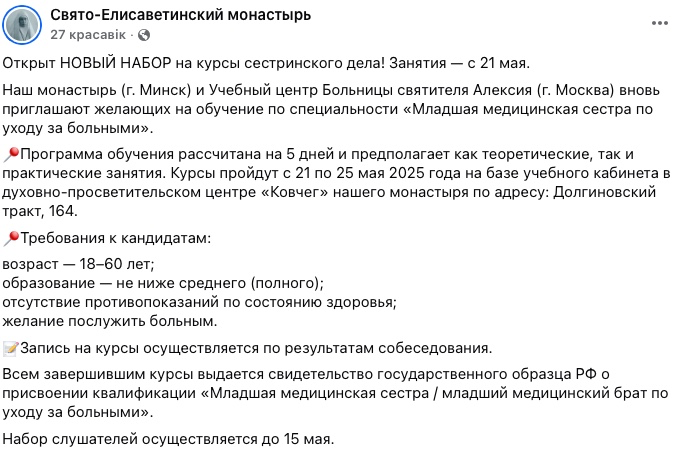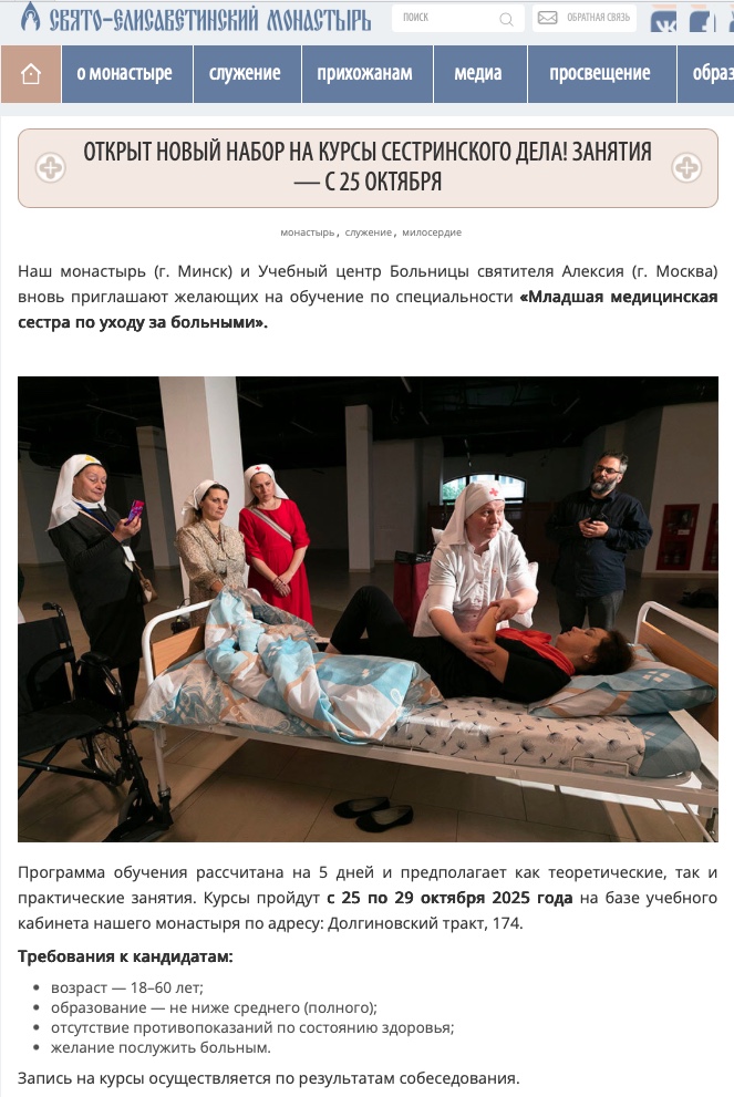 В сентябре 2025 года стало известно, что Свято-Елисаветинский монастырь в городе Минске (далее СЕМ) проводит набор на «курсы сестринского дела», которые пройдут 25-29 октября 2025 года совместно с Учебным центром Больницы святителя Алексия (Москва).